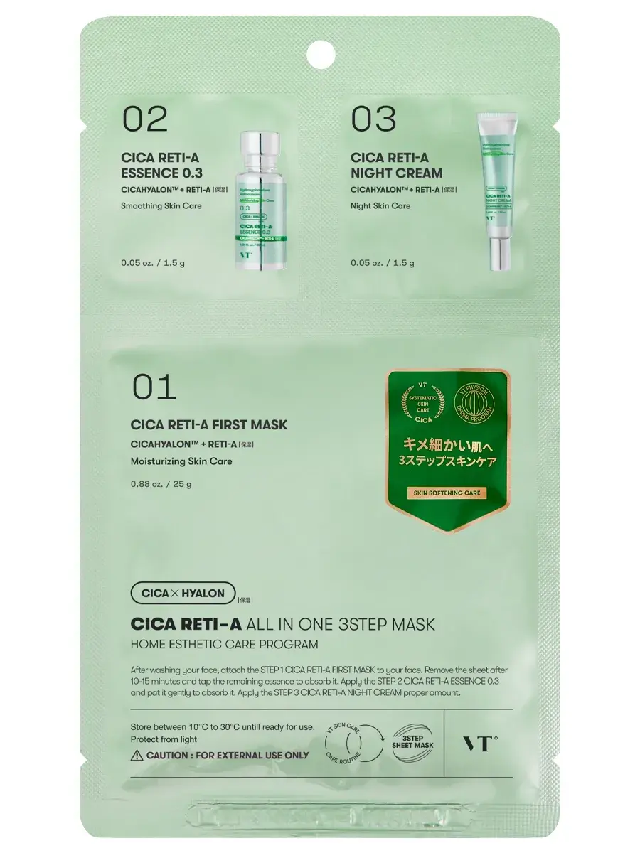 VT Cosmetics Трёхступенчатый набор с ретинолом: сыворотка-бустер + маска + крем Cica Reti-A All In One 3Step Mask 1.5+25+1.5 гр